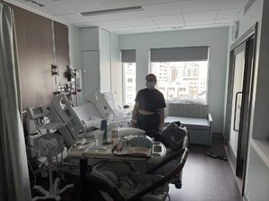 We were then given some time and a cart to pack up and move to Floor 8 of CPMC for Newborn Care. The room there is much smaller, but still quite large. I'd say about 150 sq. ft. with a nice view out the window.