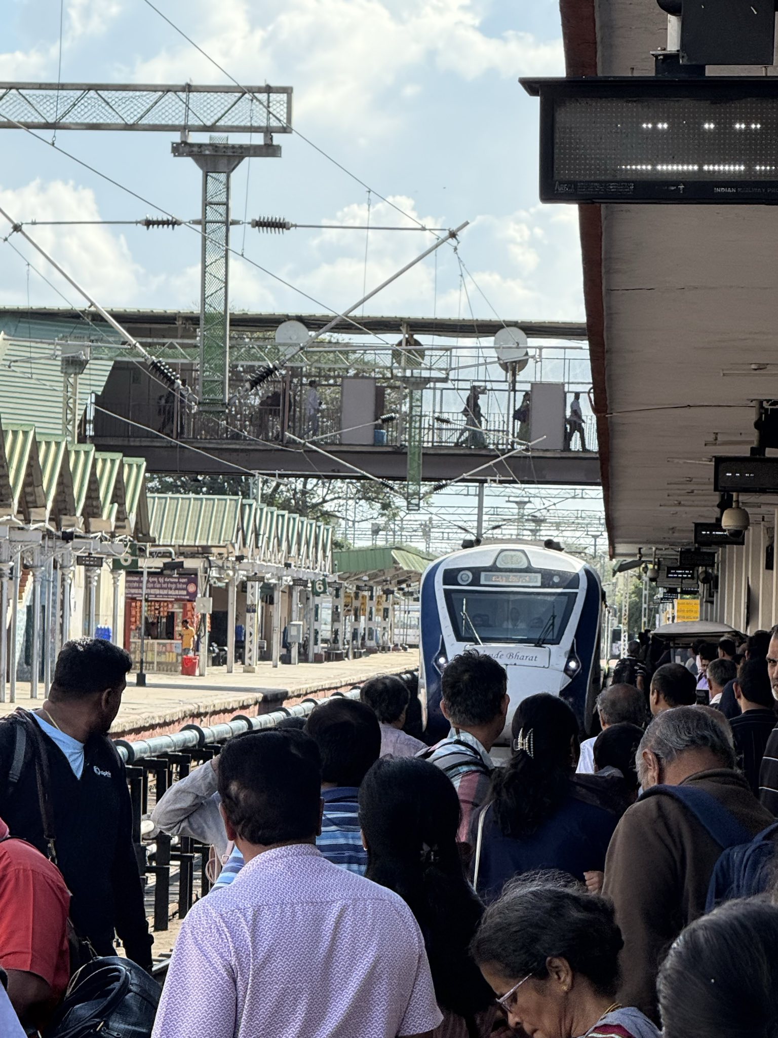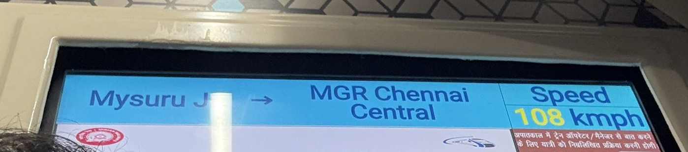 This was the biggest disappointment for me. I remember Vande Bharat being advertised as a superfast high-speed service and didn't realize that it isn't even close to it. For the majority of the ride from Bangalore to the first stop at Katpadi, the train ambled along at 108 km/h (67 mph). That's about what you get driving down I-5 from SF to LA. Hong Kong's Airport Express does 135 km/h from the Airport to the City so I was hoping that something built 25 years after that would be faster. I'm told this is because the trains are fast but the rails aren't fast yet. I'm all for incrementalism, so I hope things get faster by the time I'm there next!