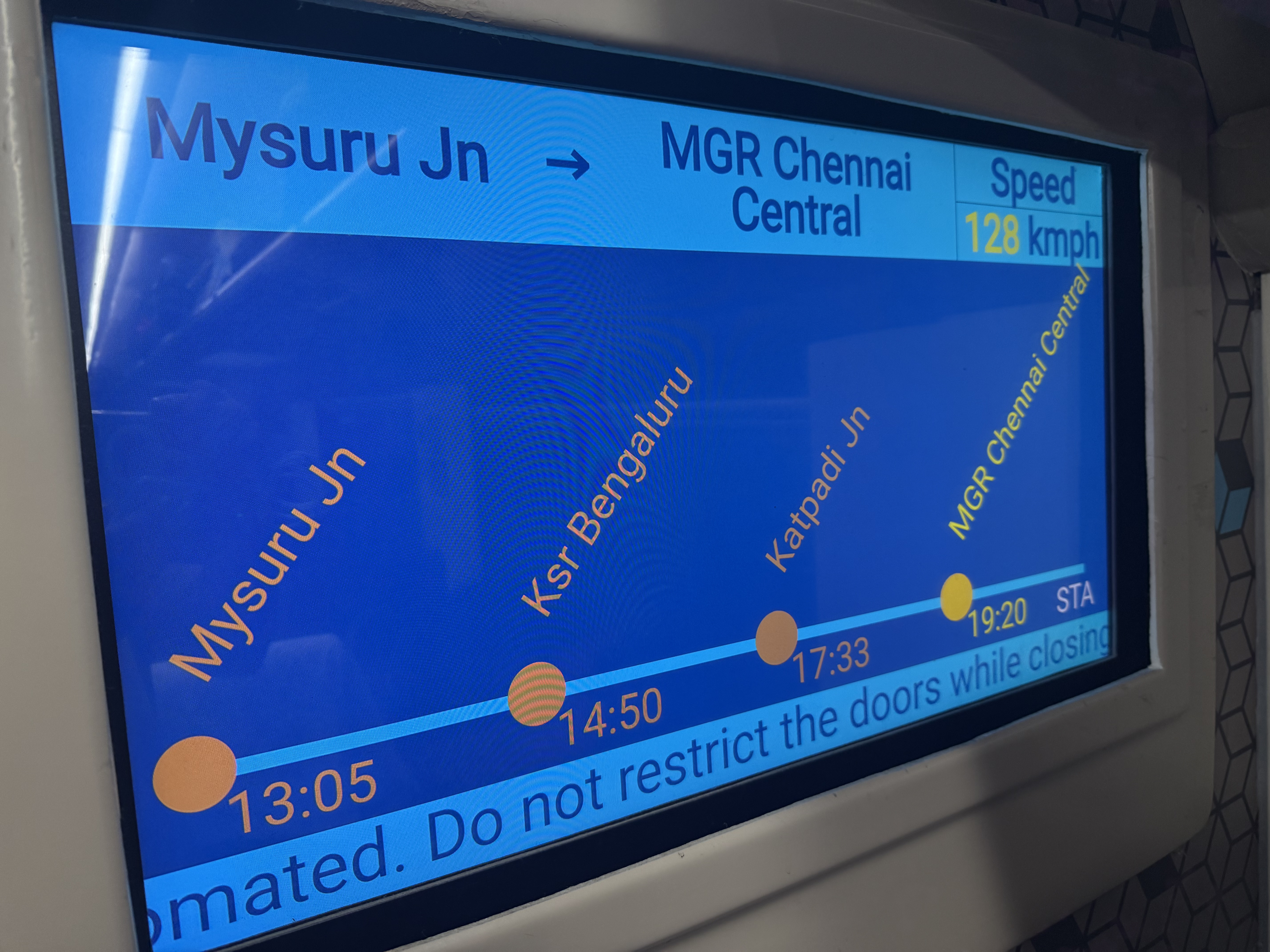 I took the Mysore-Chennai route from Bangalore to Chennai and it was quite pleasant, but I'd gotten it into my head that this was going to be like East Asian or British trains and it's not that. I have a poor memory of the Shatabdi train I'd take on that route but I recall it being quite nice and fast. This was an incremental improvement over that.