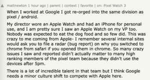 When I worked at Google I got re-orged into the same division as pixel / android. My director wore an Apple Watch and had an iPhone for personal use, and I am pretty sure I saw an Apple Watch on my VP too. Nobody was expected to eat the dog food and so few did. This was crazy to me coming from Apple- I remember several internal sites would ask you to file a radar (bug report) on why you switched to chrome from safari if you opened them in chrome. So many crazy issues I saw and reported didn’t actually matter to many high ranking members of the pixel team because they didn’t use the devices after 5pm.
