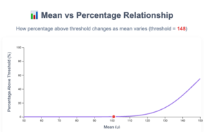 It shows a normal distribution about 100 with a standard deviation of 16. Suppose we called people who were above 148 (3x the standard deviation) Supers. To start with, a mere 0.13% of the population are Supers. Let's say that we want people to be more super and we've figured out that giving them one kg of rice a year moves them up on this index by 1. After a year, we'll see that the mean is now 101 on our original scale and 0.17% of them are Supers by the original scale.