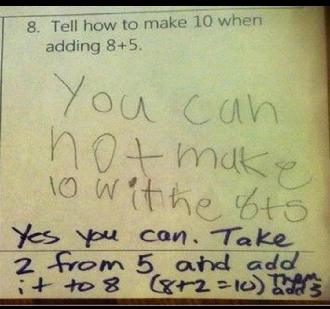 A purported photograph of a child's worksheet requiring them to use the "making tens" technique and admonishing them when they fail to understand it.