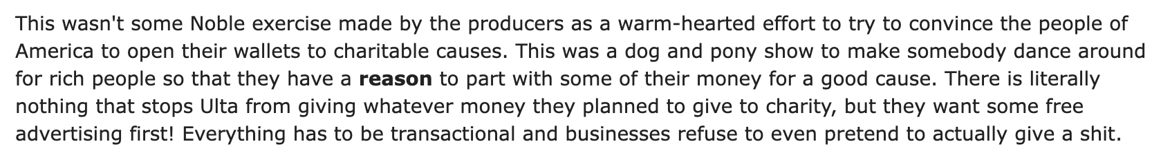 This wasn't some Noble exercise made by the producers as a warm-hearted effort to try to convince the people of America to open their wallets to charitable causes. This was a dog and pony show to make somebody dance around for rich people so that they have a reason to part with some of their money for a good cause. There is literally nothing that stops Ulta from giving whatever money they planned to give to charity, but they want some free advertising first! Everything has to be transactional and businesses refuse to even pretend to actually give a shit.