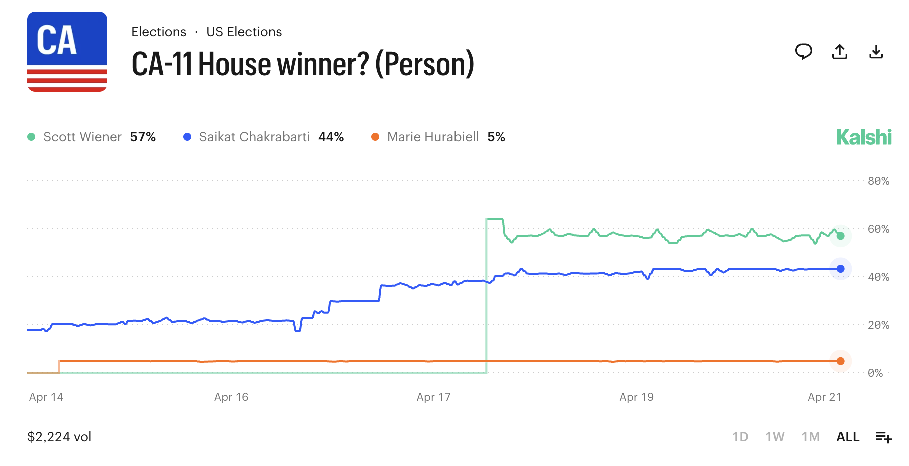 A screenshot of Kalshi's dashboard showing the CA-11 race as of Apr 21. It shows Scott Wiener and Saikat Chakrabarti at roughly even odds.