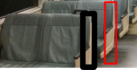 A picture of BART seats with the positions that the lady (in black) and the man (in red) were in after I made to get up