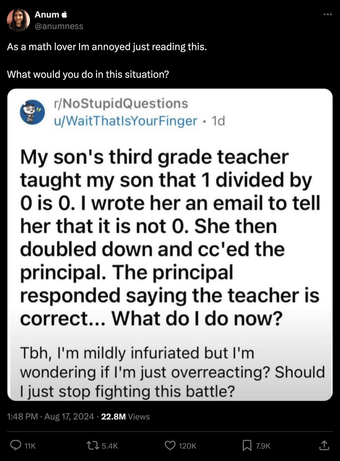 My son's third grade teacher taught my son that 1 divided by O is O. I wrote her an email to tell her that it is not 0. She then doubled down and cc'ed the principal. The principal responded saying the teacher is correct... What do I do now? Tbh, I'm mildly infuriated but l'm wondering if I'm just overreacting? Should I just stop fighting this battle?