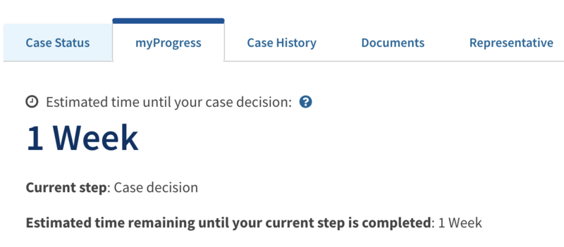 A screenshot of my I-485 progress tab on USCIS's website. It says there's a week to go.