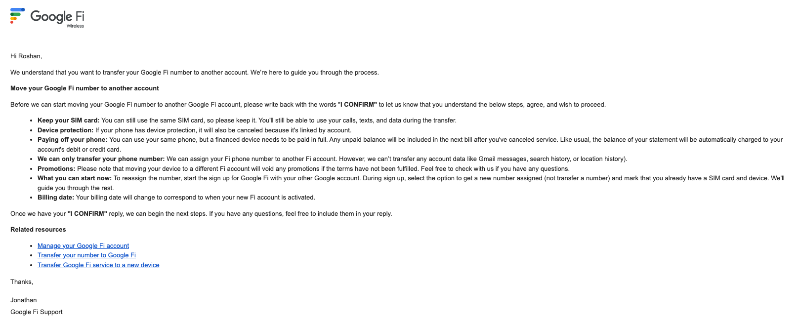 So now I embarked on the journey of transferring my Google Fi plan to my personal account. There's a flow for this in Google's support system but it's not well-documented clearly.